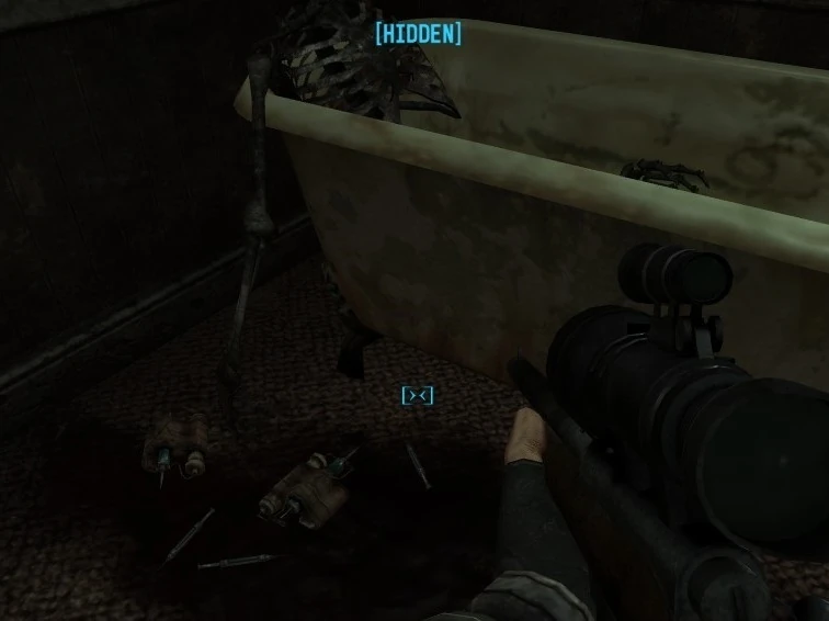 And holy FUCK did that piss off her ex-lover because even as he bled out, he pinned her to the bed, grabbing her by the throat and strangling her even as she tried to kick him in the crotch again. The knife shot out and sunk in his groin, getting a groan out of even me. The guy was undeterred, though. Adrenaline must have been going for him to not drop like a rock from that. With a sickening pop, he snapped her neck and immediately tried to get to the door for help. But when he tried to open it, it wouldn't budge. Oh, the handle could turn but the damned door wouldn't move an inch. He was trapped. At that time, I felt that presence from the other room in this vision, tainted with malice but still invisible. Panicked, the twice-murderer made for the bathroom and I guess he was a hardcore partier because... Not a single stimpak but plenty of psycho and med-X. He climbed into the tub and frantically tried to shoot up with whatever he could, probably in some kind of misguided attempt to keep from bleeding out but it could have just been trying to dull the pain of his passing. Either way, the needles wouldn't even pierce his skin. It was like that presence was keeping him from finding any relief. He died in that tub, as was evidenced by the fact his skeleton sat in that very tub when the vision cleared, med-X and psycho lying all around him and the woman's skeleton lying on the bed still. I felt three presences now, two in some kind of pain, maybe, and the third getting some sweet satisfaction? No idea, just trying to make sense of the sensations -I- was getting. Not that those sensations stopped me from taking every piece of salvage, including those chems, and moseying right on back out of there to resume looting those corpses. What can I say? Facing death in the wasteland tends to harden you against incorporeal threats. Or it kills you. And they didn't need it anymore. Mrs. Petersen's murderous boyfriend.