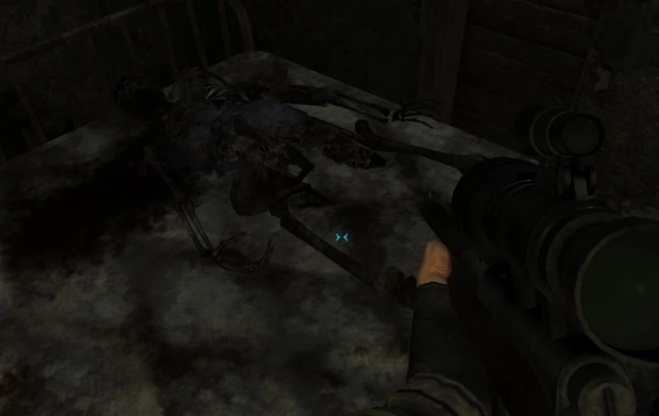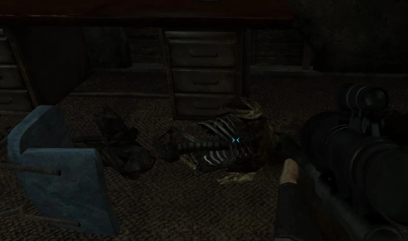 Throughout a playthrough of New Vegas, how many times does the player happen upon the skeleton of some long-dead human, possibly a victim of the nuclear holocaust that destroyed America or some poor scavenger who got in over their head? We pass these remains without a second thought, but if we look closely, we can glean some very interesting and in some cases disturbing stories behind these deaths. I'm not talking about seeing an old skeleton in a den full of Nightstalkers or lying in a pool of waste. In my travels, I've stumbled across a couple of strange occurrances. The environment around some of these stray skeletons begged investigation. I don't claim to know if these are one-hundred percent accurate, but these skeletons seemed to tell me stories. As I explore New Vegas for the umpteenth time, I will add more, hopefully turning this into a series. While I am aware that there might be other creepypastas out there that cover the same subject matter, I wish to give these my own spin. The narrator describing these events is my Courier, Ivan. (Screenshots to come shortly.)